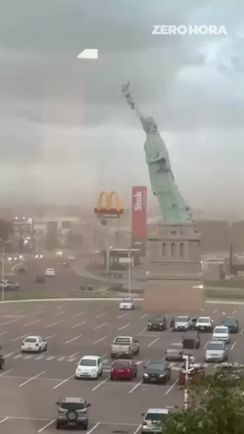 VIRADA NO TEMPO 🌀🗽 Um temporal atingiu Porto Alegre e Região Metropolitana na tarde desta segunda-feira (15). A força do vento derrubou a estátua em frente da loja Havan, em Guaíba. 📌 Por volta das 15h, a Defesa Civil do Rio Grande do Sul emitiu um alerta vermelho para tempestades com rajadas de vento acima de 90km/h. O disparo foi encaminhado para dispositivos na área. . 📹 @gzhdigital #repost
