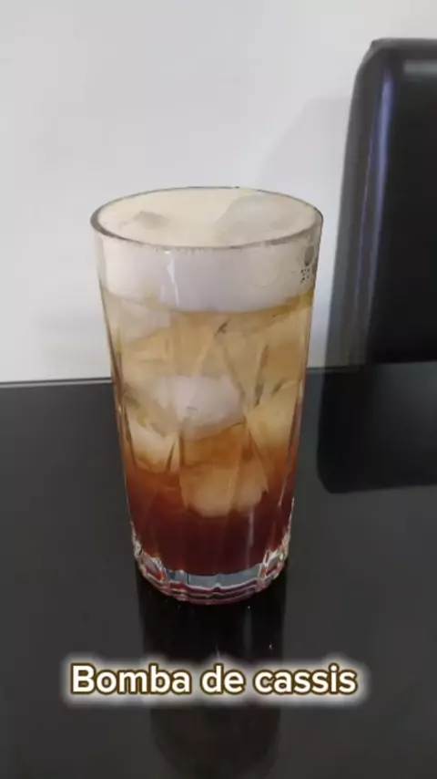 Bomba de cassis 1 dose de Licor de cassis 1 dose Energético 1 dose de Espumante rose 1 dose de Suco de laranja Em um copo alto, adicione a dose de licor de cassis e suco de laranja, mexa um pouco e adicione o gelo no copo. Complete com o energético e com o espumante. #bebidas #viral #viralvideos #viralreels #drinks