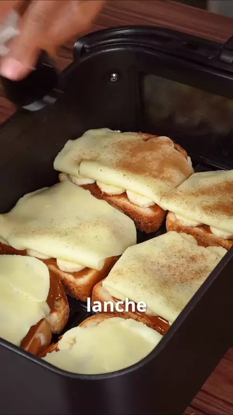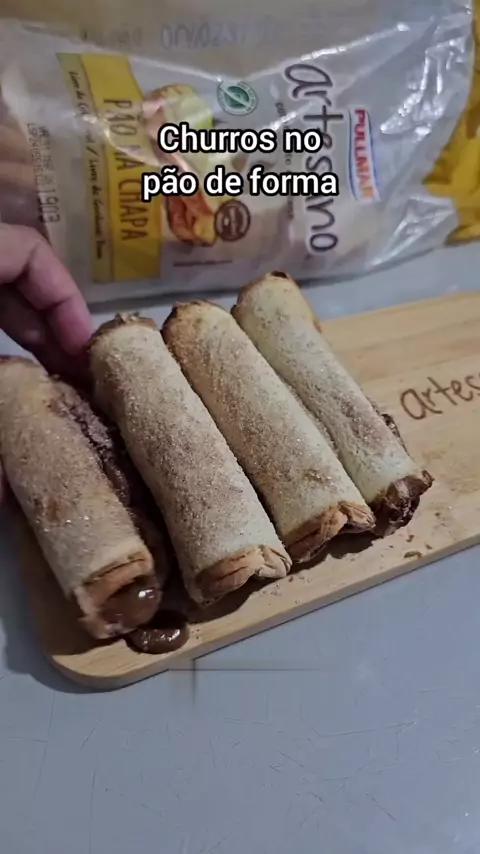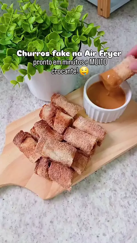 . Churros no Pão de forma Pão de forma Doce de leite 1 colher de Açúcar 1 colher de Canela 1 colher de manteiga . Amasse o Pão de forma Passe doce de leite e enrole Leve a manteiga no micro-ondas para derreter Coloque os pães enrolados na airfryer por 5 minutos a 180 graus ,
