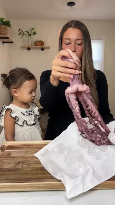 Pulpo con chimichurri 🐙 Octopus w chimichurri 🔥 Ingredients: 1 clean, whole fresh octopus Remove the beak Boil water with onion and bay leaves Dip 3 times in boiling water then then place head down Boil for 50 minutes For chimichurri sauce: 1 bunch of flat leaf parsley 1-2 garlic cloves minced 2 tsp dried oregano Red pepper flakes salt to taste 1/2 cup olive oil 1/4 cup red wine vinegar Cut off octopus head and slice the legs apart Brush with chimichurri Grill