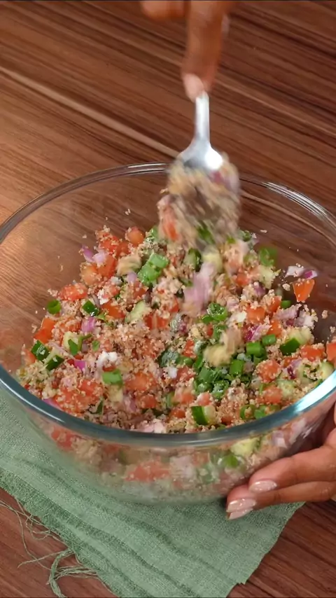 TABULE FÁCIL E DELICIOSO Você precisa fazer esse tabule, receita árabe, refrescante e deliciosa! Ingredientes: ½ xícara de trigo para kibe ½ xícara de água quente ½ pepino sem sementes 1 tomate sem sementes ½ cebola roxa 1 dente de alho 5 folhas de hortelã 1 colher de chá de azeite ½ limão Salsinha e cebolinha a gosto Pimenta-do-reino a gosto 1 colher de chá de sal Azeite a gosto #receita #receitasimples #receitafacil #salada #aperitivo