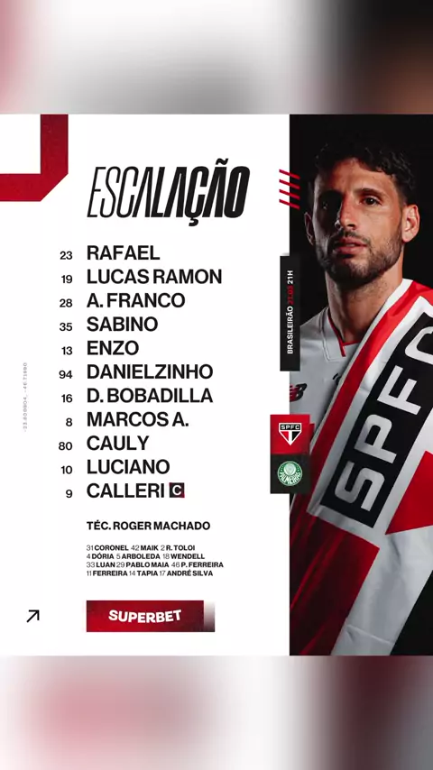 🇾🇪 O Tricolor está escalado! ⚽️ São Paulo x Palmeiras 🏟️ MorumBIS  ⏰ 21h 🏆 Brasileirão   📺 Premiere e Sportv 🎙️ SPFC Play