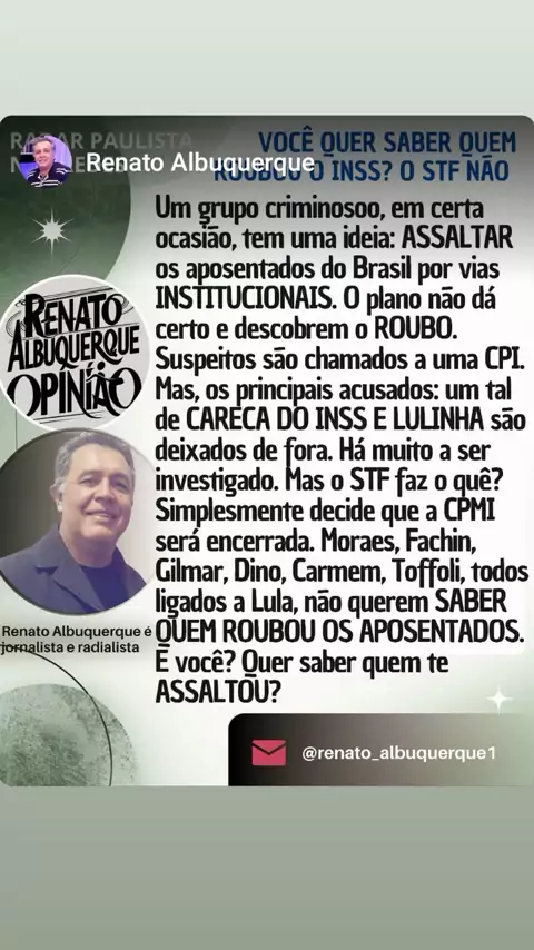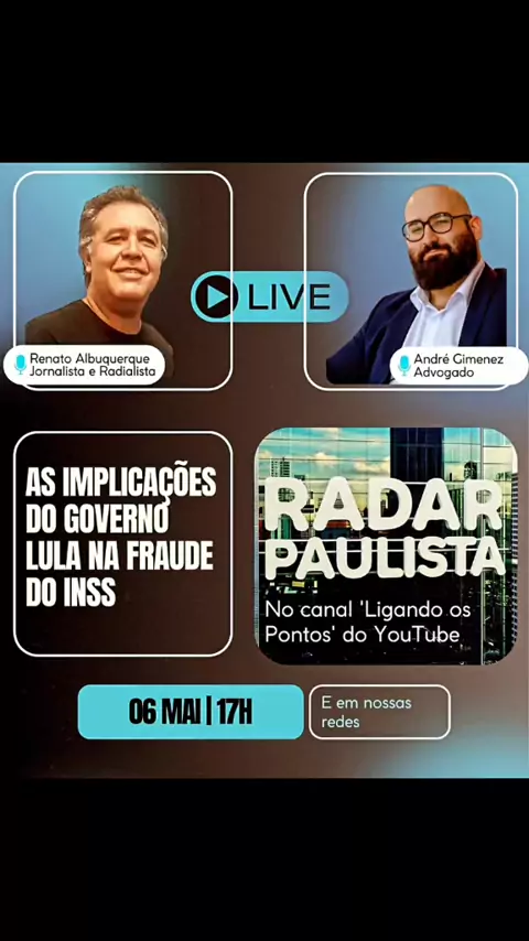 RP NAS REDES, E AS PRINCIPAIS NOTÍCIAS DO DIA (17/11/25): • FARRA DO DINHEIRO: INSS LIBERA CONSIGNADOS PARA CRIANÇAS E BEBÊS • INÍCIO DA SEMANA TEM PREVISÃO DE CHUVAS FORTES NO SUL E SUDESTE E MUITO MAIS VOCÊ CONFERE... ...no www.rpnasredes.com.br Conexão com a informação (Renato Albuquerque, da Redação do Radar Paulista) DIVULGUE SUA MARCA E FAÇA NEGÓCIOS PELO RP NAS REDES #farra #dinheirodopovo #rombo #INSS #emprestimos #