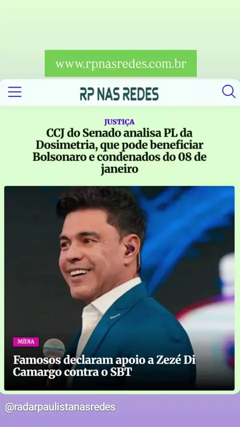 RP NAS REDES, E AS PRINCIPAIS NOTÍCIAS DO DIA (17/12/25): PL DA DOSIMETRIA É ANALISADO PELA CCJ DO SENADO O APOIO DE FAMOSOS A ZEZÉ DI CAMARGO, APÓS EMBATE COM SBT E MUITO MAIS VOCÊ CONFERE... ...no www.rpnasredes.com.br Conexão com a informação (Renato Albuquerque, da Redação do Radar Paulista) DIVULGUE E AMPLIE SEUS NEGÓCIioOS NO 'RP NAS REDES'. 📰🗞 #sbt #midia #emissoradeteve #teve #imprensa