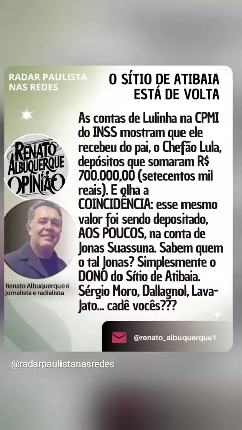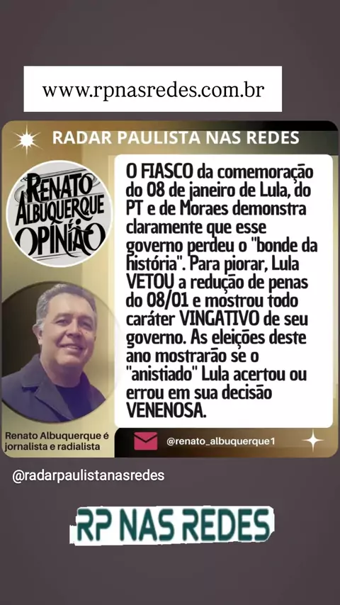 RP NAS REDES, E AS PRINCIPAIS NOTÍCIAS DO DIA A VOLTA DO SÍTIO DE ATIBAIA E MUITO MAIS VOCÊ CONFERE... ...no www.rpnasredes.com.br Conexão com a informação (Renato Albuquerque, da Redação do Radar Paulista) DIVULGUE E AMPLIE SEUS NEGÓCIioOS NO 'RP NAS REDES'. 📰🗞 #Lula #Lulinha #governolula #Vorcaro #romboinss RenatoAlbuquerqueJornalista RenatoAlbuquerqueRadialista RenatoAlbuquerqueApresentador RadarPaulista RP RPnasRedes radarpaulistanasredes