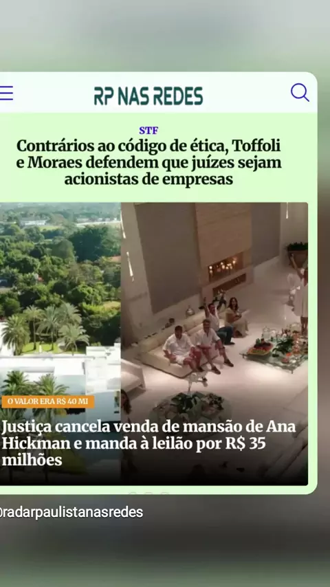 RP NAS REDES, E AS PRINCIPAIS NOTÍCIAS DO DIA (04/02/26): CONTRÁRIOS AO CÓDIGO DE ÉTICA DO STF, TOFFOLI E MORAES DEFENDEM QUE JUÍZES SEJAM ACIONISTAS DE EMPRESAS VENDA DA MANSÃO DE ANA HICKMAN É CANCELADA PELA JUSTIÇA, QUE MANDA IMÓVEL À LEILÃO E MUITO MAIS VOCÊ CONFERE... ...no www.rpnasredes.com.br Conexão com a informação (Renato Albuquerque, da Redação do Radar Paulista) DIVULGUE E AMPLIE SEUS NEGÓCIioOS NO 'RP NAS REDES'. 📰🗞 #alexandredemoraes #DiasToffoli #STF #anahickmann