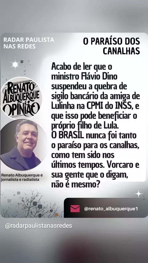 RP NAS REDES, E AS PRINCIPAIS NOTÍCIAS DO DIA (04/03/26): O PARAÍSO DOS CANALHAS E MUITO MAIS VOCÊ CONFERE... ...no www.rpnasredes.com.br Conexão com a informação (Renato Albuquerque, da Redação do Radar Paulista) DIVULGUE E AMPLIE SEUS NEGÓCIioOS NO 'RP NAS REDES'. 📰🗞 #Lula #Lulinha #governolula #Vorcaro #romboinss RenatoAlbuquerqueJornalista RenatoAlbuquerqueRadialista RenatoAlbuquerqueApresentador RadarPaulista RP RPnasRedes radarpaulistanasredes