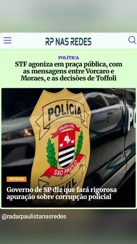 RP NAS REDES, E AS PRINCIPAIS NOTÍCIAS DO DIA (06/03/26): LEGITIMIDADE DO STF VAI POR ÁGUA ABAIXO COM TROCAS DE MENSAGENS ENTRE VORCARO E MORAES, ALÉM DAS DECISÕES ULTRAJANTES DE TOFFOLI GOVERNO DE SP DIZ QUE VAI INVESTIGAR COM RIGOR A CORRUPÇÃO NAS POLÍCIAS E MUITO MAIS VOCÊ CONFERE... ...no www.rpnasredes.com.br Conexão com a informação (Renato Albuquerque, da Redação do Radar Paulista) DIVULGUE E AMPLIE SEUS NEGÓCIioOS NO 'RP NAS REDES'. 📰🗞 #STF #Vorcaro #Moraes #Toffoli #Lulinha