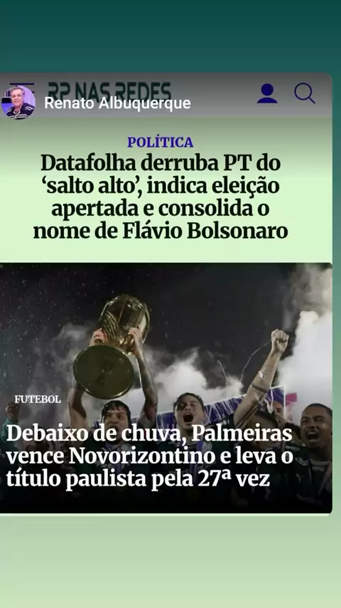 RP NAS REDES, E AS PRINCIPAIS NOTÍCIAS DO DIA (09/03/26): PESQUISA DATAFOLHA DESBANCA FAVORITISMO DE LULA E COLOCA FLÁVIO BOLSONARO EM ASCENSÃO OS CAMPEÕES: EM SP, PALMEIRAS; NO RIO, FLAMENGO; EM MG, CRUZEIRO E MUITO MAIS VOCÊ CONFERE... ...no www.rpnasredes.com.br Conexão com a informação (Renato Albuquerque, da Redação do Radar Paulista) DIVULGUE E AMPLIE SEUS NEGÓCIioOS NO 'RP NAS REDES'. 📰🗞 #lula #governolula #flaviobolsonaro #palmeiras #cruzeiro RenatoAlbuquerque