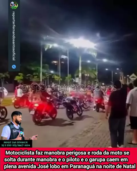 🚨 IMPRUDÊNCIA NO TRÂNSITO 🚨 Um motociclista realizava manobras perigosas quando a roda da moto se soltou, provocando a queda do piloto e do garupa em plena Avenida José Lobo, em Paranaguá, na noite de Natal. As imagens mostram o momento exato do acidente, que poderia ter terminado em tragédia, já que a via é movimentada. A imprudência colocou em risco não apenas os ocupantes da motocicleta, mas também outros motoristas e pedestres. ⚠️ Manobras perigosas são infração grave e podem resultar e