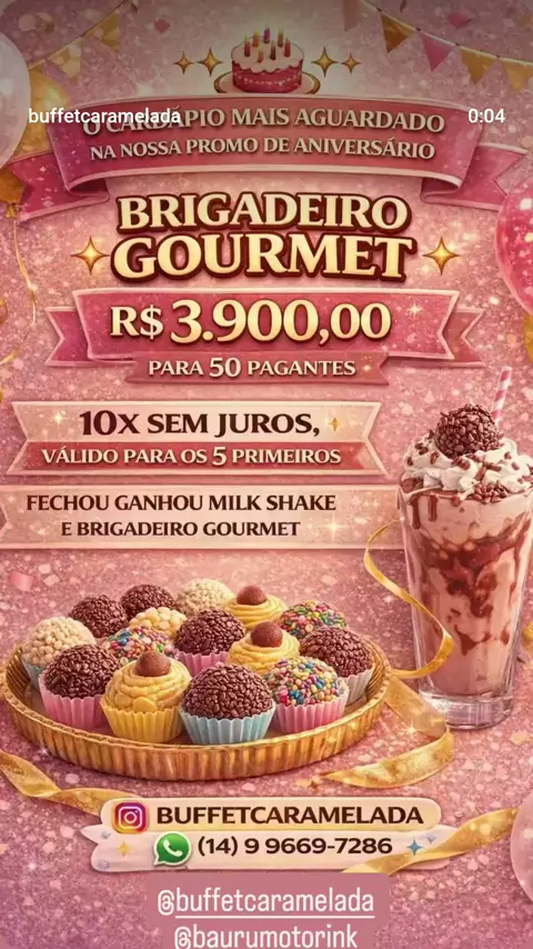 ✨ O cardápio mais aguardado da nossa Promo de Aniversário chegou! ✨ 🍫 BRIGADEIRO GOURMET que conquista no primeiro sabor e transforma sua festa em um verdadeiro espetáculo! 🎉 50 pagantes por R$ 3.900,00 💳 10x sem juros 🎁 Fechou, ganhou Milk Shake + Brigadeiro Gourmet 🚨 Válido somente para os 5 primeiros contratos! Aqui no Buffet Caramelada, cada detalhe é pensado para encantar seus convidados e deixar sua comemoração inesquecível 💖 📲 Garanta sua data agora! 👉 WhatsApp: (14) 9 9669-72