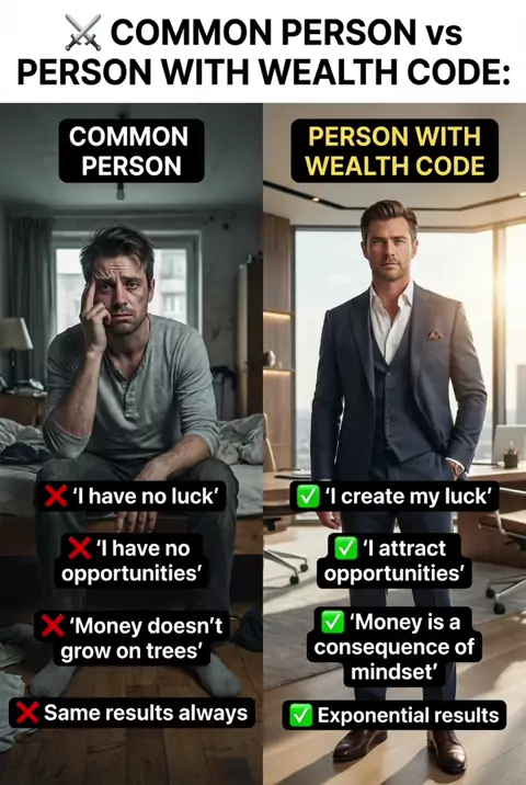 ⚔️ COMMON PERSON vs PERSON WITH WEALTH CODE: Common person: ❌ 'I'm unlucky' | ❌ 'No opportunities' | ❌ 'Money doesn't grow on trees' | ❌ Same results always. Person with CODE: ✅ 'I create my luck' | ✅ 'I attract opportunities' | ✅ 'Money is consequence of mindset' | ✅ Exponential results. The difference? One has the CODE, the other doesn't. 💀 Which group do you want to be in? Answer: 'COMMON' or 'CODE' 🔥 #wealthcode #comparison #millionairemindset #mindset #transformation