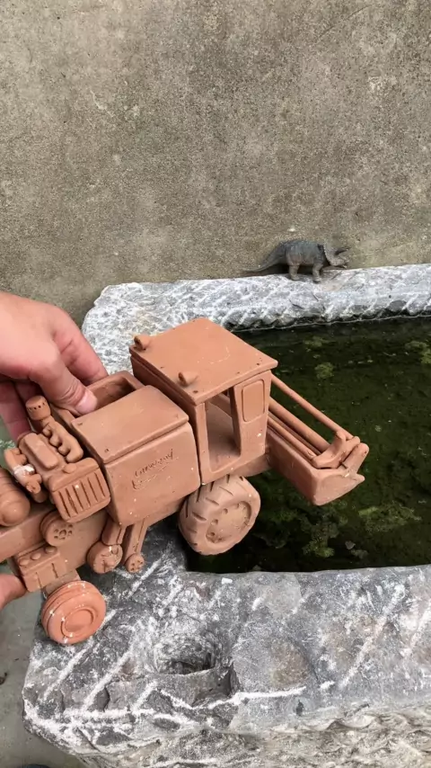 O caminhão de lama está na água.