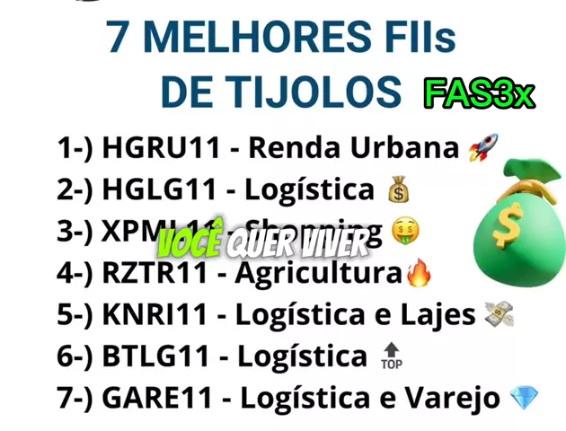 FAS3x - EDUCAÇÃO FINANCEIRA Quer viver de aluguel sem ter um imóvel no seu nome? Esses 7 FIIs de tijolo colocam o dinheiro pra trabalhar por você todos os meses! 🧱💰 Comece a investir com pouco e construa sua renda passiva com inteligência. 📲 Salva esse post e compartilha com quem quer viver de renda! #RendaPassiva #FIIs #InvestimentoInteligente #LiberdadeFinanceira #FundoImobiliário 🚀 Comente “quero viver de renda” se você também está nesse