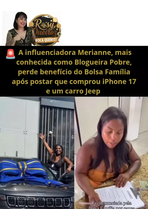 A influenciadora Merianne mais conhecida como Blogueira Pobre perde o benefício do Bolsa família após postar que comprou um iPhone 17 e um carro Jeep. #Notícia #noticias #fofoca