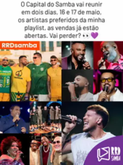 O Brasil se encontra no @capitaldosambaoficial nos dias 16 e 17 de maio. Alcione, Alexandre Pires, Péricles, Belo, Dilsinho, Raça Negra, Sorriso Maroto, Menos é Mais, Ferrugem e Samba 90 Graus são as atrações confirmadas. As vendas abrem no dia 29/01, às 12h. Bora? 👀💜 #rrdsamba #capitaldosamba #riodejaneiro #pagode #samba
