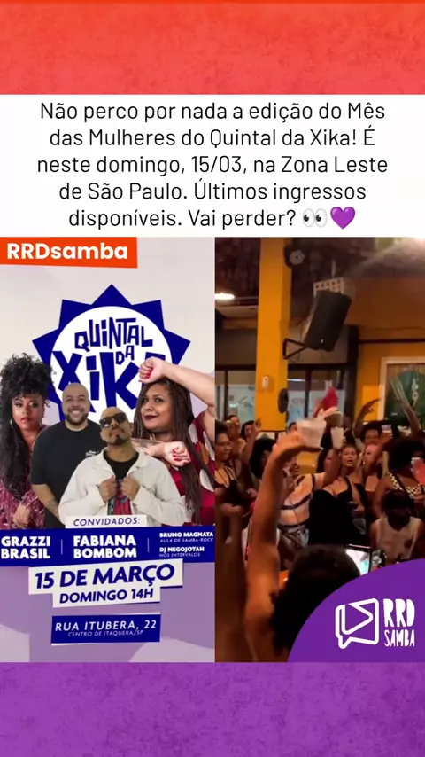 É neste domingo, 15/03! Edição especial do Mês das Mulheres do @quintaldaxika com Grazzi Brasil, Fabiana Bombom e mais, na Zona Leste de São Paulo. Últimos ingressos disponíveis. Bora? 👀😍 #rrdsamba #quintaldaxika #samba #pagode #saopaulo