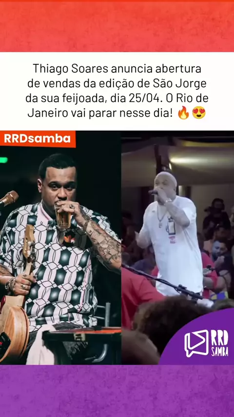 O @Thiago Soares faz a edição de São Jorge da sua feijoada no dia 25/04, no Rio de Janeiro. As vendas abrem amanhã, sexta, 13/03, às 12h. Vai perder? 👀💜 #rrdsamba #thiagosoares #samba #riodejaneiro #pagode