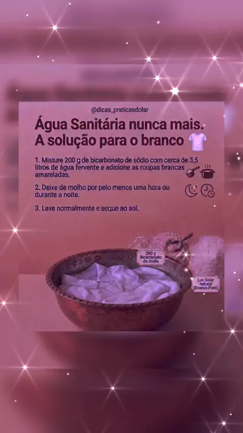 Dica de ouro passando na sua tela! 🏆👕 Sabe aquela blusa branca favorita que começou a amarelar? Não joga fora e nem taca cloro nela! (O cloro pode até corroer o tecido com o tempo, sabia? 😱). Faz assim: 1️⃣ Bicarbonato + Água fervente. 2️⃣ Molho caprichado. 3️⃣ Sol para finalizar. É mágico e super econômico! 💸 Quem aí já testou esse truque? Me conta nos comentários se funcionou com você! 👇 Siga @dicas_praticasdolar para facilitar sua rotina! #dicasdolar #dicasdecasa #roupabranca #lavarroupa