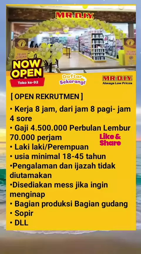 Lowongan kerja terbaru 2025 • Kerja 8 jam, dari jam 8 pagi- jam 4 sore • Gaji 4.500.000 Perbulan Lembur 70.000 perjam • Laki laki/Perempuan • usia minimal 18-45 tahun • Pengalaman dan ijazah tidak diutamakan • Disediakan mess jika ingin menginap • Bagian produksi Bagian gudang • Sopir • DLL #infoloker #loker #mrdiy2025 #mrdiy #lewatberanda #lowongankerja # #karyawan #loker2025 #lokermrdiy