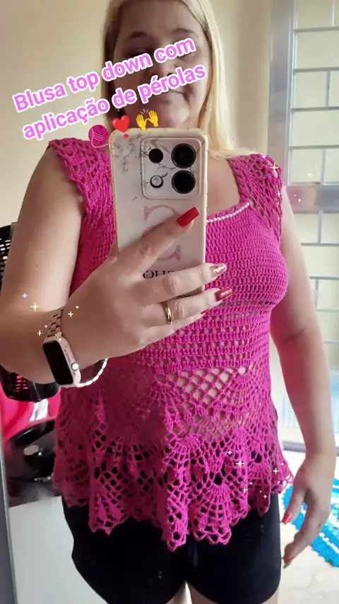 Mais uma peça confeccionada em crochê, essa blusa é linda além de poder fazer de várias cores #Vem2026NoKwai #croche #dicademoda #crocheterapia #feitoamão
