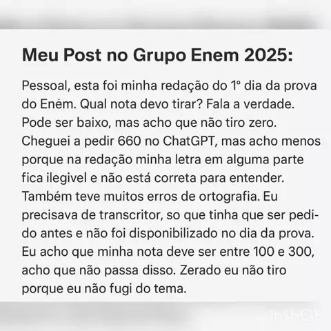 "E aí, pessoal! 🚀 Compartilho com vocês minha redação do ENEM 2025. Sei que não foi perfeita (a letra e a ortografia me sabotaram 😅), mas o importante é não desistir! 💪 Recebi uns comentários polêmicos sobre minhas chances e minhas 'limitações', mas tô aqui pra mostrar que #DeficiênciaNãoDefine! 😉 Rumo à Pedagogia! 📚 #ENEM2025 #Redação #Inclusão #TDAH " tag