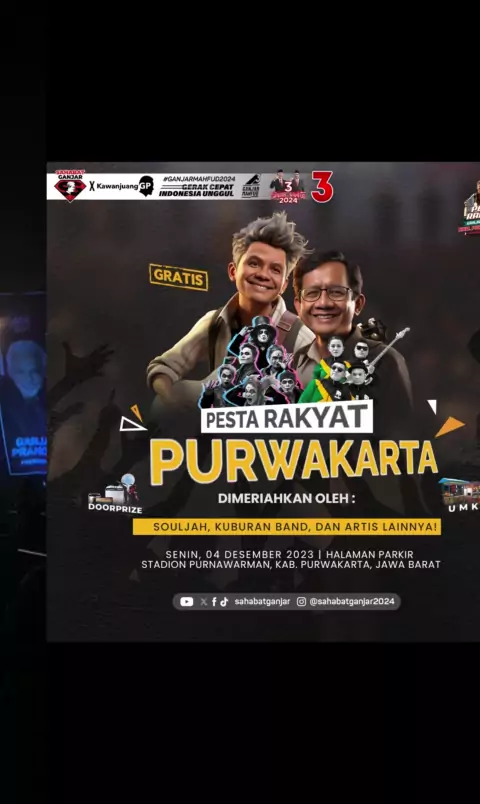 Senin, 4 November 2023, Halaman Parkir Stadion Punawarman, Purwakarta, jadi saksi konser epic! Souljah, Kuburan Band, dan banyak artis top lainnya bakal mengguncang stage di Pesta Rakyat Ganjar-Mahfud Purwakarta!! 🔥 #SahabatGanjar #GanjarPranowo #Ganjar #GanjarMahfud2024