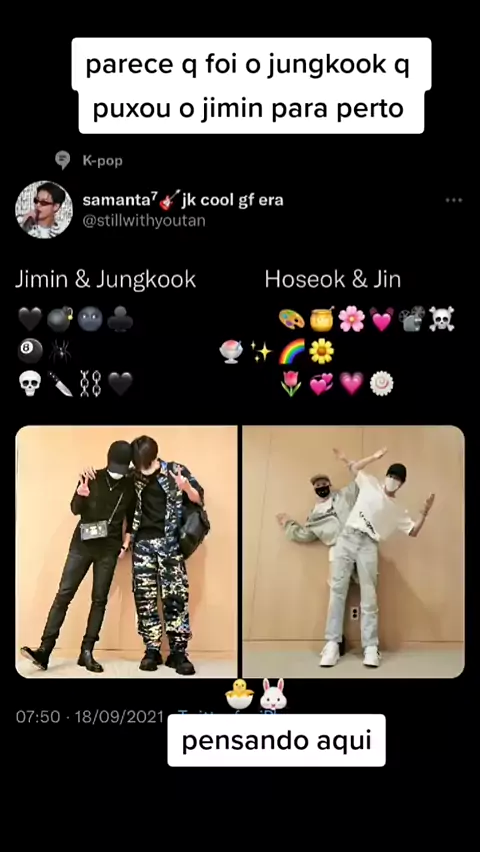 Eu não sei se isso é real ,ou só imaginação da minha cabeça. E se não for ,eu shipei o melhor casal já visto . Essa cumplicidades, esses olhares, sorrisos ,tudo . Eu tô mal ,eu sofro vendo heters caindo em cima dos meninos, pessoas me ameaçando no meu direct por causa que sou #jikook 💔🥺. Eu amo vocês, eu importo com vocês . Obrigada por tudo meus amores. por me fazerem feliz ☺. Eu sou jikook até o fim .#QuercasarComigo #vermelho #DesafioDeAgachar #ENCAIXADINHA