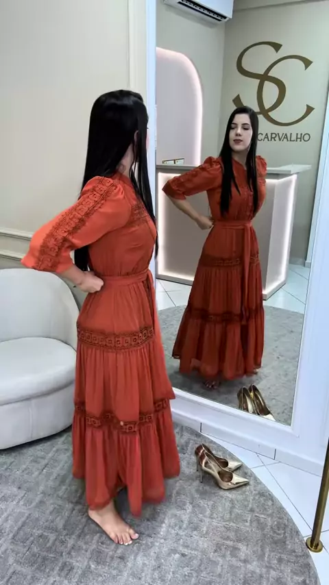Vestido Gabriella na cor terra cota 👗😍❤️‍🔥 Compras ou mais informações através do WhatsApp 45 991447800 ou site www.saracarvalhobrand.com.br #vestidos #modamodesta #look