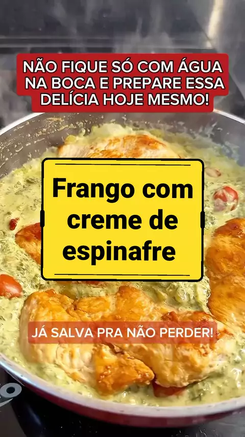 FRANGO COM CREME DE ESPINAFRE Ingredientes peito de frango 2 caixinhas de creme de leite espinafre a gosto 1 xicara de parmesão tomatinhos a gosto 1 cebola pequena #Receita #receitasfaceis #Comida #frango #almoço