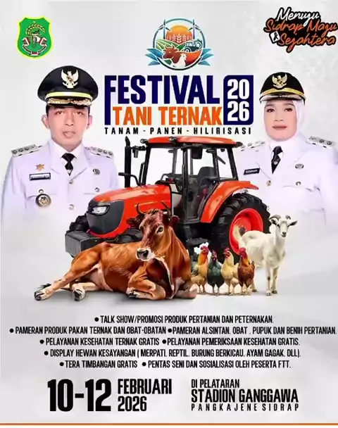 Ayo datangki' Semua di Festival Tani Ternak 2026 TANAM - PANEN - HILIRISASI 🗓️10-12 Februari 2026 📍Di Pelataran Stadion Ganggawa Pangkajene Sidrap Terbuka Untuk Umum!! Ayo Ke Sidrap!! #saromasesidenrengrappang #festivaltaniternaksidrap2026 #bupatisidrap #syaharuddinalrif #ayokesidrap