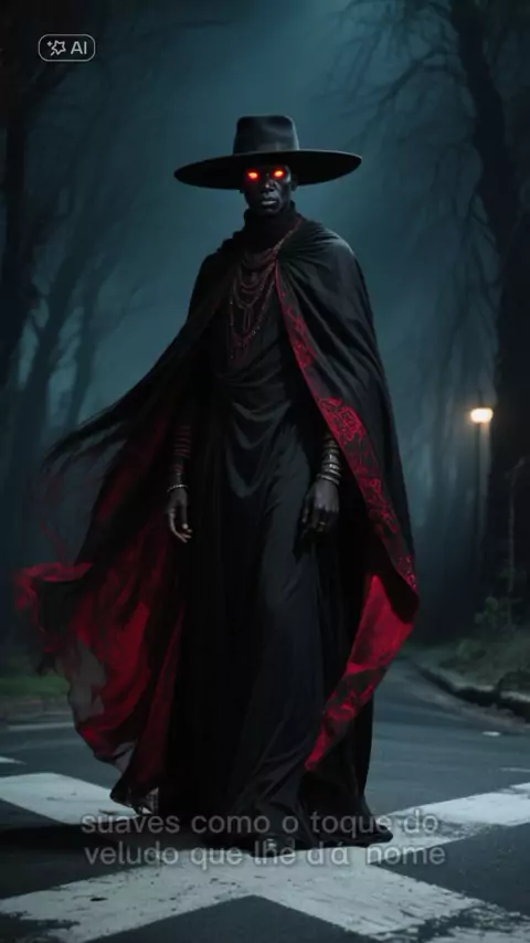 "No silêncio da encruzilhada, ele surge: Exu Veludo, capa preta e vermelha, chapéu imponente, carregando os segredos e mistérios que só ele conhece. Entre o sagrado e o proibido, ele caminha, guiando aqueles que ousam chamá-lo. #ExuVeludo #Umbanda #Candomblé #Exu #Mistério