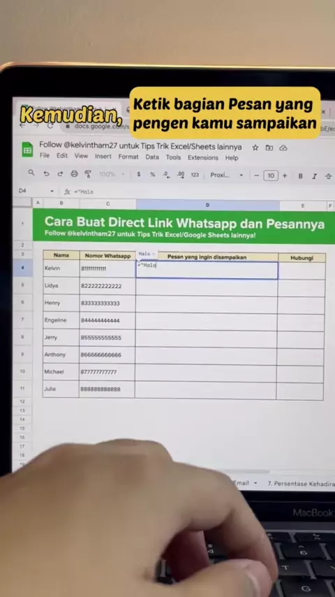 [โ€ผ๏ธ๐—•๐—”๐—–๐—” ๐—–๐—”๐—ฃ๐—ง๐—œ๐—ข๐—ก ๐—•๐—œ๐—”๐—ฅ ๐—Ÿ๐—˜๐—•๐—œ๐—› ๐—ฃ๐—”๐—›๐—”๐— โ€ผ๏ธ] Kirim pesan Whatsapp sesuai nama masing-masing lewat Google Sheets? ๐Ÿ˜ฑ Bisa banget! Nih, aku kasih tau link yang perlu kamu pake biar bisa ikutan tutorial di Video ya: =HYPERLINK(""https://api.whatsapp.com/send?phone="" &ENCODEURL(62&<cell>) & ""&text=""&ENCODEURL(<cell>),""Hubungi"") *bagian kata cell nanti perlu diganti, tonton video tutorial biar tau cara gantinya gimana Gas kuy dicoba! ๐Ÿ˜Œ๐Ÿš€ ๐—๐—ฎ๐—ป๐—ด๐—ฎ๐—ป ๐—น๐˜‚๐—ฝ๐—ฎ ๐—Ÿ๐—œ๐—ž๐—˜, ๐—ฆ๐—”๐—ฉ๐—˜...