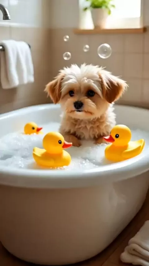 Cachorrinho tomando banho de espuma com patinhos de borracha #animação #ia #viral #engraçado #cachorrinho