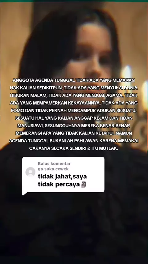 Membalas @ga.suka.cewekTanpa agenda tunggal, memangnya kalian berani melawan sesuatu hal yang diluar batas porsi dirimu? Seperti peperangan ditimur tengah? Seperti kasus Brazil? Seperti kasus Filipina? Seperti kasus Thailand? Sesuatu hal yang terlihat kejam dimata orang awam, sesungguhnya tidak semuanya jahat. Agenda Tunggal jauh lebih mengetahui seluruh aib peradaban sekecil apapun itu dan mana yang pantas dibabat. Sebab kalian hidup didunia, dimana orang munafik ada disekitar kalian.