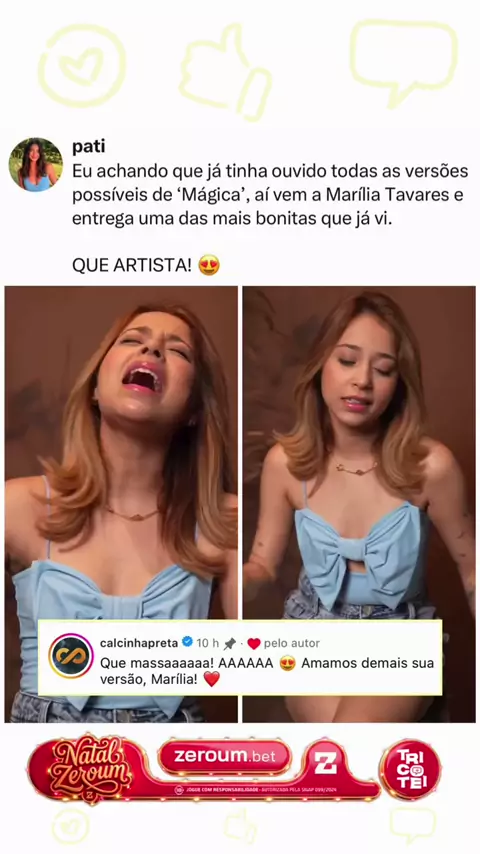 A cantora Marília Tavares vem viralizando ao postar nos Reels sua interpretação de “Mágica”, do Calcinha Preta, mostrando talento e emoção na voz que poucas pessoas conseguem alcançar. Uma internauta resumiu bem a reação geral ao vídeo: ao ouvir a versão, ela confessou que já achava ter escutado todas as versões possíveis da música, mas que Marília entregou uma das mais bonitas que já viu, exclamando “QUE ARTISTA! 😍”. Até a própria banda celebrou a performance, comentando que amou a versão e vi