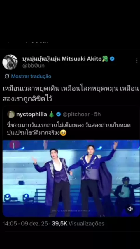 Tradução do post do X: 🥦:Gostei muito! No primeiro dia não gravei a música inteira, mas no segundo consegui registrar tudo. O show do BounPrem foi muito bom🥺 🐱: Parece que o tempo parou. Que o mundo parou de girar. Que nós dois estávamos destinados a ficar juntos. #bb0un #บุ๋นเปรม #BounPrem #prem_space