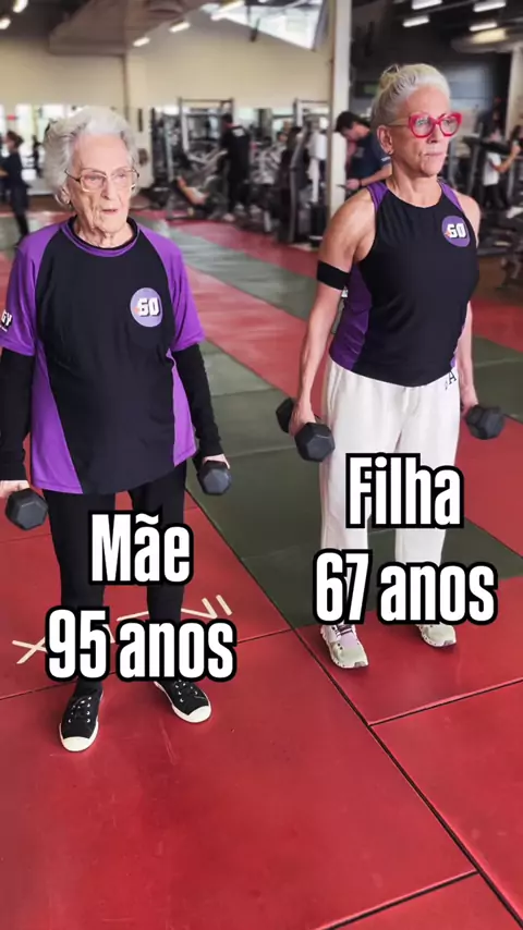 💪💜 Mãe e filha treinando juntas! Monica, 67, e Maria Helena, 95, fazendo bíceps com halteres na academia — força, autonomia e afeto no mesmo movimento. Exercício essencial para o dia a dia e para manter a independência em qualquer idade. 🌱 #Treino #Musculação #gym #fitness #malhar