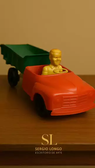 🧸 Caminhão Marx Auto Mac Windup – Década de 1950 Um raro exemplar do lúdico industrial norte-americano. Produzido pela Louis Marx & Co., traz o encanto das antigas miniaturas de fricção, onde o movimento era mecânico e o sorriso do motorista moldado em plástico dizia tudo: infância, engenho e memória. 📏 A: 6 L: 5 P: 12 cm | No estado.