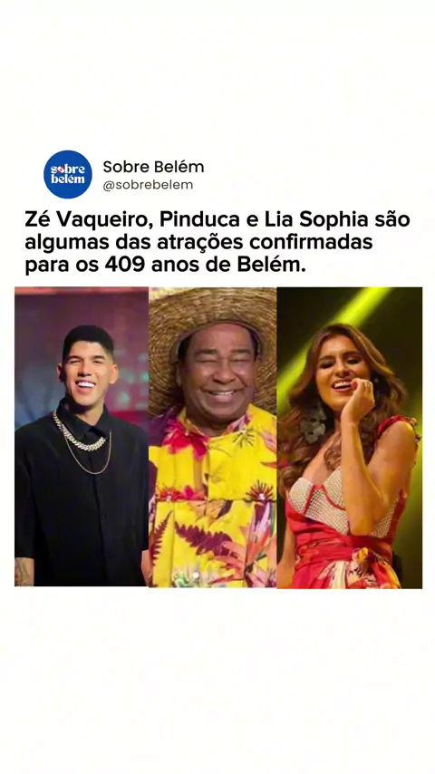 Zé Vaqueiro, Pinduca e Liah Sophia estão entre as atrações confirmadas para os 409 anos de Belém. A programação contará com três dias de festividades, incluindo serviços à população na sexta (10) e sábado (11), como consultas médicas, exames e emissão de documentos. O ponto alto será no domingo (12), no Portal da Amazônia, com apresentações de Liah Sophia, Pinduca, Zé Vaqueiro e outros artistas locais, encerrando com um espetáculo e queima de fogos. Siga: @sobrebelem #belem #belemdopa #belem