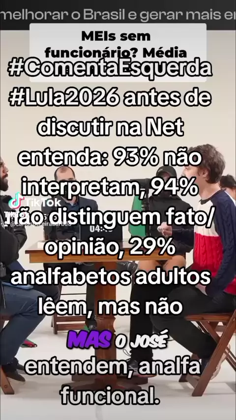#ComentaEsquerda #Lula2026 DICA:93% não interpretam,94% não distinguem fato/opinião,29% analfabetos adultos lêem, mas não entendem , analfa funcional. Antes de discutir na internet, lembre-se: só 8% dos brasileiros interpretam um texto, apenas 6% sabem diferenciar fato de opinião, e 29% dos adultos são analfabetos funcionais (leem, mas não entendem). Só comente postagem de esquerda, 50% do engaja direita é da ESQUERDA 😃🤝olhe de lado😃faça de vista grossa, deixem eles falando