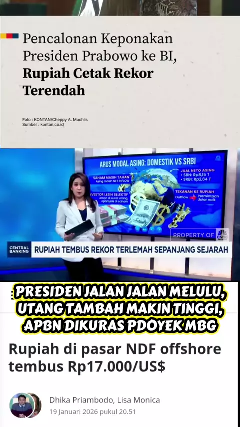 Nilai tukar rupiah menyentuh level terendah sepanjang sejarah terhadap dolar Amerika Serikat (AS) pada Selasa (20/1/2026), seiring kekhawatiran investor terhadap independensi Bank Indonesia (BI) setelah Presiden Prabowo Subianto mengajukan keponakannya sebagai calon anggota Dewan Gubernur BI. Melansir Reuters, rupiah melemah hingga level Rp 16.985 per dolar AS, menjelang keputusan kebijakan moneter BI pekan ini. Konsensus analis memperkirakan bank sentral akan mempertahankan suku bunga acuannya...