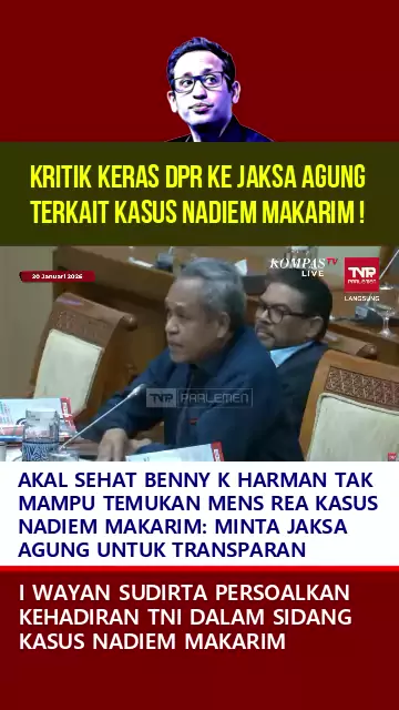 KRITIK KERAS DPR TERHADAP JAKSA AGUNG SOAL KASUS NADIEM MAKARIM Anggota Komisi III DPR, Benny K Harman, menyatakan sulit menemukan mens rea (niat jahat atau unsur kesengajaan kriminal) dalam kasus Nadiem Makarim berdasarkan akal sehat. Ia menyebut Nadiem sebagai figur cerdas, berpendidikan di negara maju, dan sengaja diundang kembali ke Indonesia untuk membangun bangsa. Namun tiba-tiba muncul kasus ini tanpa penjelasan mens rea yang transparan. Karena itu, Benny mempertanyakan mens rea kasus Na...