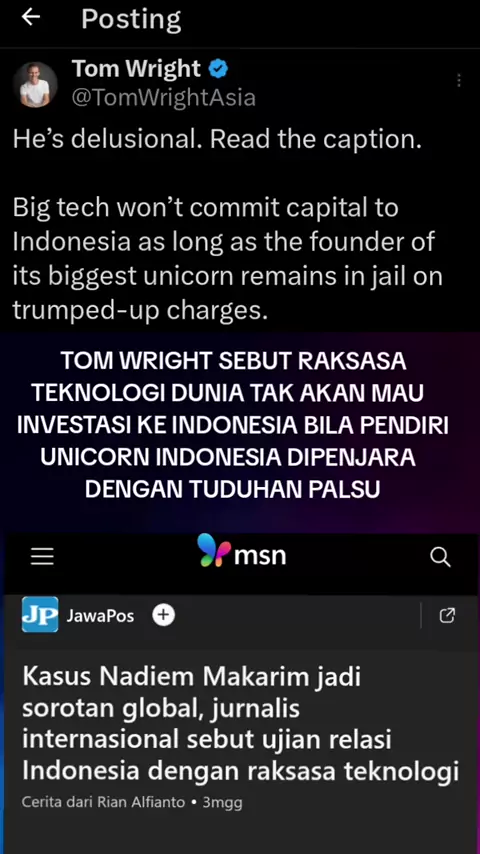 Jurnalis Amerika, Tom Wright, melontarkan kritik terhadap isi pidato Presiden Prabowo Subianto dalam forum World Economic Forum (WEF) di Davos. Melalui unggahan di platform X, Tom Wright menyebut dia (Prabowo) mengalami delusi. Menurutnya, perusahaan teknologi besar tak akan mau menanamkan modal di Indonesia bila pendiri unicorn terbesar di Indonesia dipenjarakan atas tuduhan palsu.