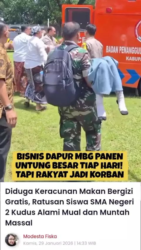 Ratusan Siswa SMA 2 Kudus dilarikan ke rumah sakit setelah mengeluh pusing, mual, dan muntah. Para siswa diduga mengalami keracunan menu Makan Bergizi Gratis (MBG). Sejumlah siswa mengeluh mual dan pusing sejak Kamis (29/1) pagi. Hingga Kamis siang para siswa yang mengeluh gejala serupa semakin banyak. Plt Kepala Dinas Kesehatan (Dinkes) Mustiko Wibowo mengatakan, pihaknya yang menerima laporan langsung berkoordinasi dengan rumah sakit untuk menerjunkan ambulans. "Ada dugaan para siswa keracuna...