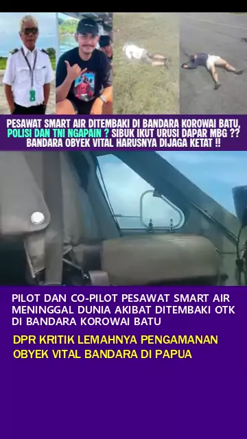 PILOT DAN CO-PILOT PESAWAT SMART AIR MENINGGAL DUNIA AKIBAT DITEMBAKI DI BANDARA KOROWAI BATU : POLISI DAN TNI NGAPAIN ? SIBUK IKUT URUS MBG? OBYEK VITAL HARUSNYA DIJAGA KETAT Pesawat Cessna milik PT Smart Air Aviation dilaporkan ditembak di Bandara Koroway Batu, Kabupaten Boven Digoel, Papua Selatan, pada Rabu pagi. Saat iyu, pesawat terbang dari Bandara Tanah Merah menuju Lapangan Terbang Korowai dengan membawa 13 penumpang. Namun, saat tiba di Lapangan Terbang Korowai, pesawat ditembaki. Par...