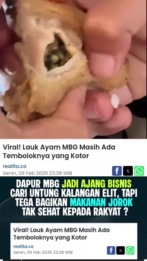 Video adanya tembolok ayam berisi kotoran pada menu Makanan Bergizi Gratis (MBG) bikin meboh media sosial. Tembolok ayam itu baru digigit siswa, tapi isinya dalam tembolok kotor dan bikin panik. Karena itu, siswa segera lapor kepada guru. 'Gak tau pasti itu ayamnya makan apa sebelumnya yang pasti sangat jorok membuat yang melihatnya saat itu muntah-muntah juga. Gurunya juga sangat shock melihat tembolok tersebut, sangat menyeramkan isinya," tulis netizen akun hienna_art.han