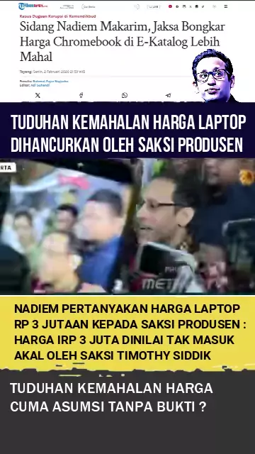 TUDUHAN KEMAHALAN HARGA LAPTOP DIHANCURKAN OLEH SAKSI PRODUSEN, HARGA LAPOTOP CHROMEBOOK RP JUTAAN DINILAI TAK MASUK AKAL Selama proses persidangan kasus pengadaan laptop chrome book, jaksa menilai ada kemahalan harga di e-katalog karena harga di pasaran hanya sekitar Rp 3 jutaan. Sebagai terdakwa, Nadiem Makarim mempertanyakan masalah ini secara langsung kepada saksi dari produsen laptop. Apakah harga laptop tiga jutaan itu, masuk akal? Menurut saksi dari vendor Zyrex, Timothy Siddik selaku Di...