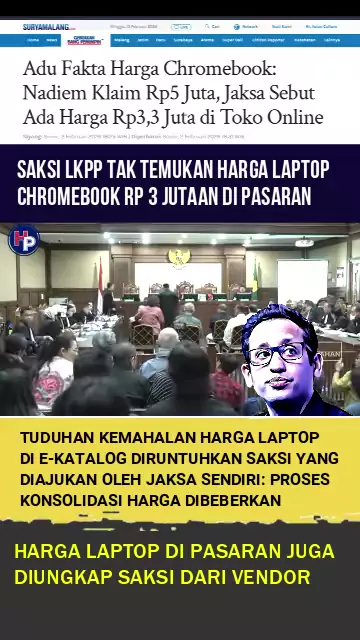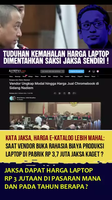 TUDUHAN KEMAHALAN HARGA LAPTOP CHROMEBOOK DIPATAHKAN SAKSI DARI JAKSA SENDIRI Sidang kasus pengadaan laptop chrome book dengan terdakwa Nadiem Makarim, diwarnai adu fakta terkait tuduhan kemahalan harga laptop chrome book dari jaksa penuntut umum. Menurut jaksa, harga laptop dalam e-katalog lebih mahal dari harga di pasaran yang disebut hanya sekitar 3 jutaan rupiah. Namun dalam pemeriksaan saksi dari LKPP dan vendor yang diajukan jaksa, ternyata biaya produksi laptop dari pabriknya saja mencap...