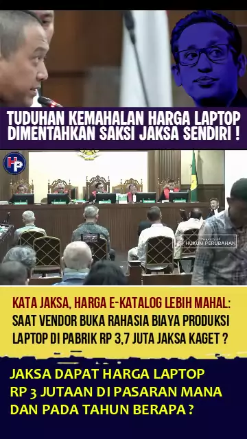 TUDUHAN KEMAHALAN HARGA LAPTOP CHROMEBOOK DIPATAHKAN SAKSI DARI JAKSA SENDIRI Sidang kasus pengadaan laptop chrome book dengan terdakwa Nadiem Makarim, diwarnai adu fakta terkait tuduhan kemahalan harga laptop chrome book dari jaksa penuntut umum. Menurut jaksa, harga laptop dalam e-katalog lebih mahal dari harga di pasaran yang disebut hanya sekitar 3 jutaan rupiah. Namun dalam pemeriksaan saksi dari LKPP dan vendor yang diajukan jaksa, ternyata biaya produksi laptop dari pabriknya saja mencap...